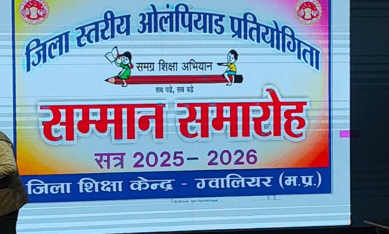 भितरवार — बालभवन सभागार में जिला स्तरीय ओलंपियाड परीक्षा में चयनित 32 छात्र-छात्राओं का सम्मान श्रीमान मुख्य कार्यपालन अधिकारी जिला पंचायत जिला ग्वालियर द्वारा किया गया। शिक्षण सत्र 2025- 26 के ओलंपियाड परीक्षा हेतु जन शिक्षा केंद्र स्तरीय परीक्षा हेतु 22093 रजिस्ट्रेशन के विरुद्ध 21983 छात्र छात्राओं ने भाग लिया। जिसमें चयनित 3520 छात्र-छात्राओं में से जिला स्तरीय परीक्षा में 3496 छात्र सम्मिलित हुए ,जिला स्तर से कक्षा 2 से कक्षा 8 तक प्रत्येक विषय में एक-एक छात्र चयनित हुए