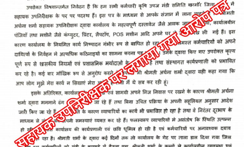 दरअसल, मुरैना जिले की कृषि उपज मंडी समिति बामौर के कर्मचारियों ने संयुक्त संचालक ग्वालियर संभाग को लिखित शिकायत भेजकर मंडी सचिव अर्चना शर्मा पर गंभीर आरोप लगाए हैं। कर्मचारियों का कहना है कि सहायक उपनिरीक्षक अर्चना शर्मा द्वारा कार्यालय के महत्वपूर्ण दस्तावेज जैसे आवक-जावक पंजियां, कार्यालयीन रजिस्टर और कंप्यूटर, प्रिंटर, लैपटॉप, POS मशीन जैसे उपकरण अपने घर ले जाकर रख लिए गए हैं।